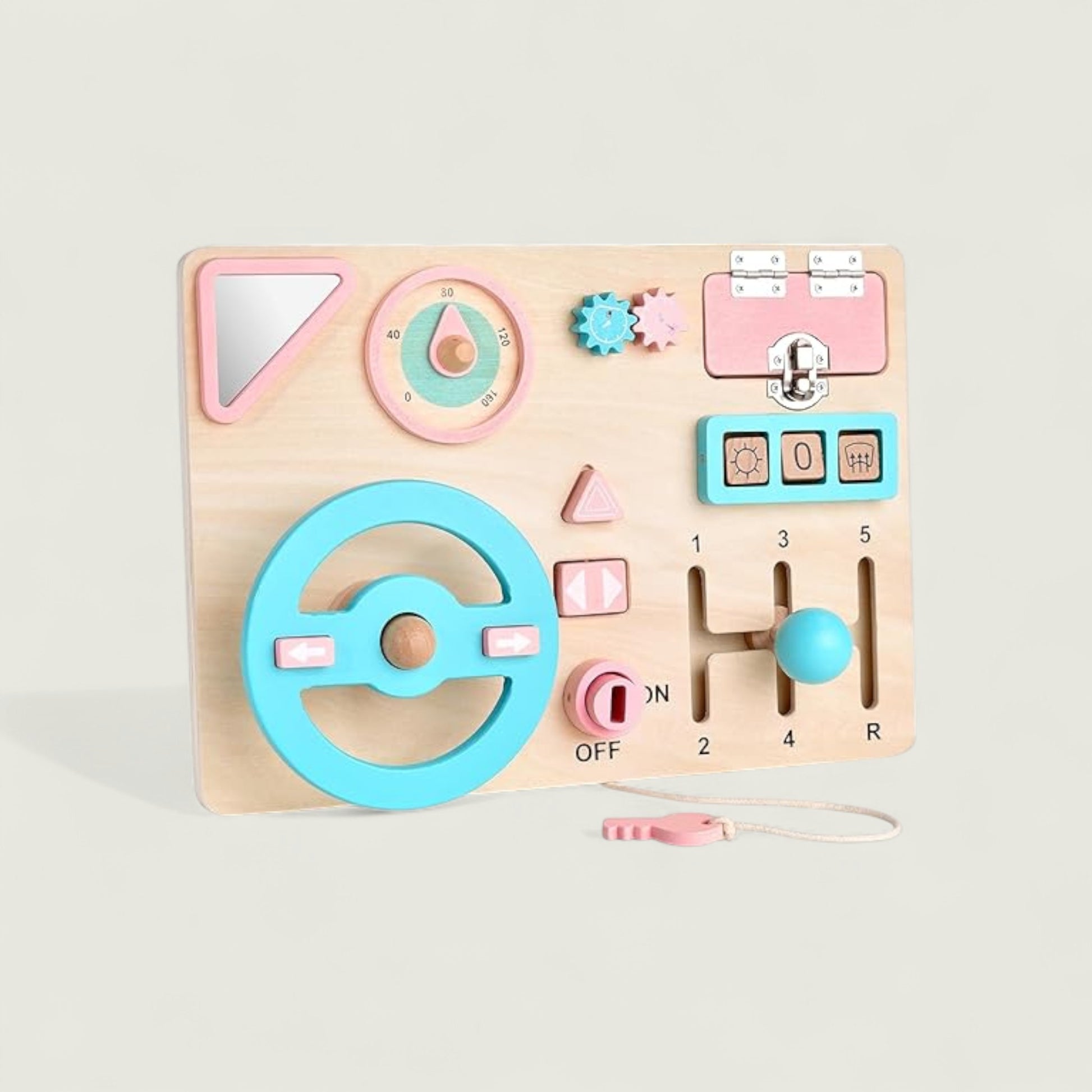 Made from high-quality, child-safe wooden materials, this busy board features engaging elements such as a steering wheel, gear shifter, ignition switch, rotating knobs, and gear wheels. Each interactive component helps toddlers practice essential life skills, strengthen fine motor abilities, and improve hand–eye coordination.